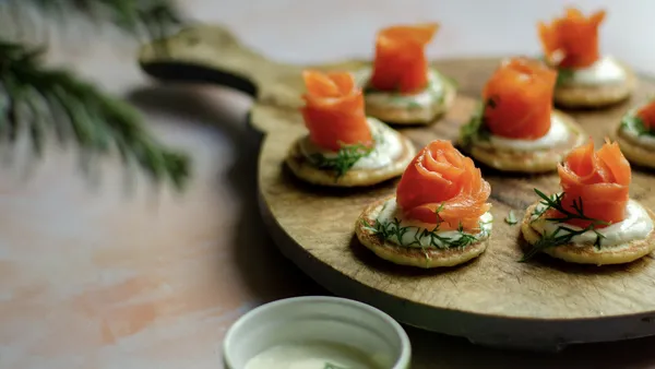 - Leg de blini’s op een serveerplank, doe een lepeltje van de mierikswortelmayonaise op elke blini, leg hierop een roosje zalm en een takje dille. En hoppa, klaar is je amuse!