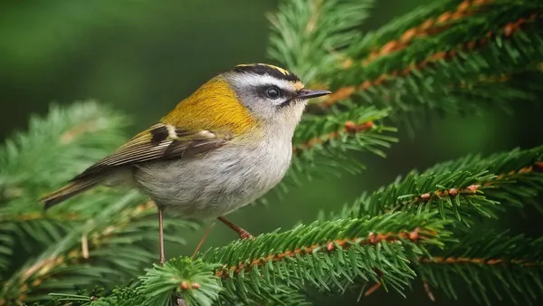 Hoewel zijn naam doet vermoeden dat hij familie is van de gewone goudhaan, zie je van dichtbij een wereld van verschil. De vuurgoudhaan draagt namelijk een opvallend 'masker'. Waar de gewone goudhaan een vrij braaf gezichtje heeft, herken je dit vogeltje aan zijn felle, witte wenkbrauwstreep en een gitzwarte oogstreep. De kroon op het werk is de dieporanje kruinstreep bij de mannetjes, die tussen het groen van de naaldbomen oplicht als een klein vuurtje.