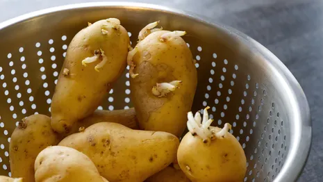 - Lange uitlopers, rimpelige aardappel: als de uitlopers langer zijn dan een paar centimeter en de aardappel zacht of rimpelig aanvoelt, is waarschijnlijk het gehalte solanine te hoog geworden. Bovendien heeft de uitloper alle zetmeel en energie uit de aardappel gezogen, waardoor de smaak en textuur achteruit zijn gegaan. Deze kun je dus beter weggooien.