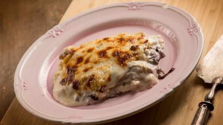 - Vet een ovenschaal in met boter. Doe daarna een dun laagje bechamelsaus op de bodem. Leg hierop een laag lasagnebladen. Verdeel daarover een deel van het witlofmengsel en de stukjes ham. Dek af met een laagje saus en wat geraspte kaas. Herhaal dit tot de ingrediënten op zijn. Eindig met een royale laag bechamelsaus en de rest van de kaas.