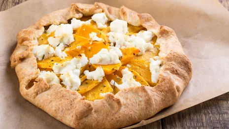 - Verwarm de oven voor op 220 graden. Haal het deeg uit de koelkast en rol het op een vel bakpapier uit tot een grote, nonchalante ronde lap. Schep het pompoenmengsel met de ui en knoflook in het midden van het deeg en laat de buitenste rand van circa 5 centimeter helemaal vrij. Verkruimel de feta en de Parmezaanse kaas gelijkmatig over de vulling.